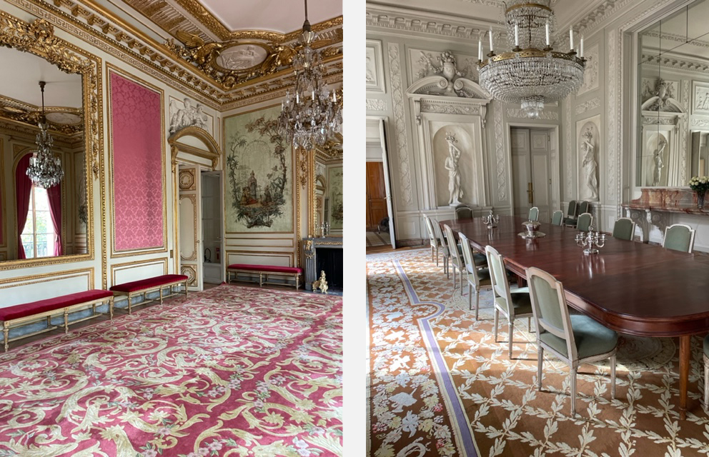 En cambio ahora nos encontramos con ambientes amplios, alegres y luminosos gracias a los altos ventanales y al trompe l’oeil de los espejos. Nos maravillamos con la elaborada ornamentación del techo, con los tapices orientales, con la biblioteca y sus incunables, con los detalles que decoran la chimenea.