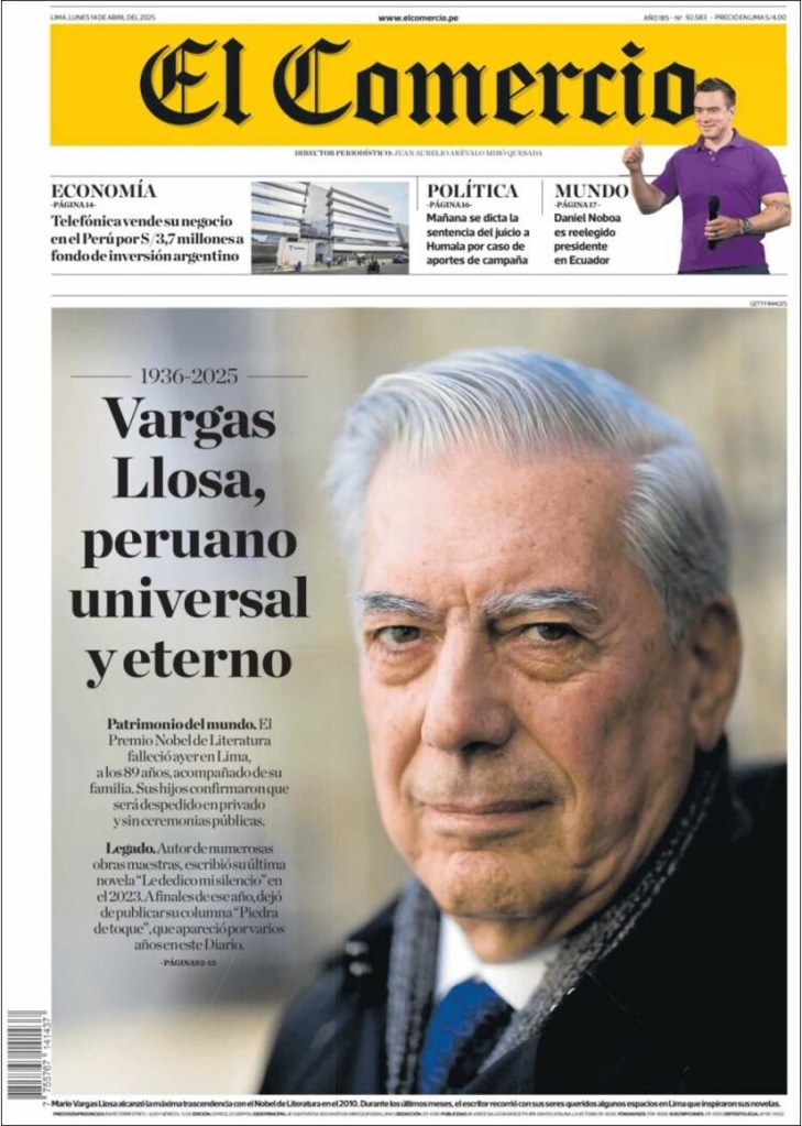 El periódico más antiguo del Perú, por ejemplo, anunció así su muerte en portada: “Mario Vargas Llosa, peruano universal y eterno”.